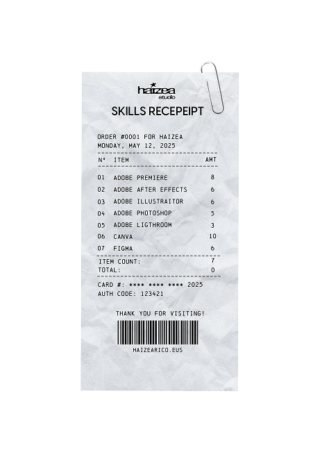 Haizea naiz, lanerako prest beti, eta saiatzen naiz nire onena ematen egiten dudan guztian. Pertsona sortzailetzat daukat neure burua, eta batez ere mundu ikus-entzunezkoak erakartzen nau. Editatzea eta diseinatzea dira gehien disfrutatzen ditudan lanak.
